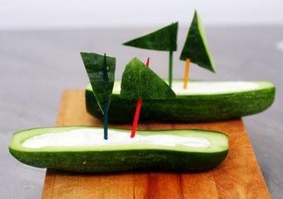Directions: Slice cucumbers in half. Scoop out a small hole in the middle. Add a dab of yogurt. Mix a pinch of sugar, salt, and cumin into the yogurt to make it spiced! Delicious!